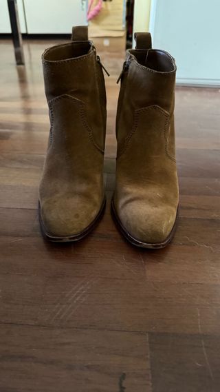 Botines de tacón de Zara en color marrón. Un básico para tu armario. - Material efecto ante. - Tacón de bloque de madera. - Detalle de aro metálico en la parte trasera. Botines Zara Antelina con cremallera Tono Camel Tacon 6 cm Como nuevos puestos una sola vez