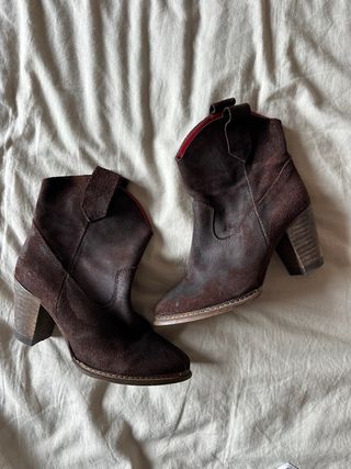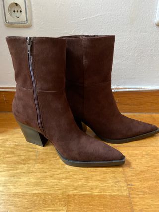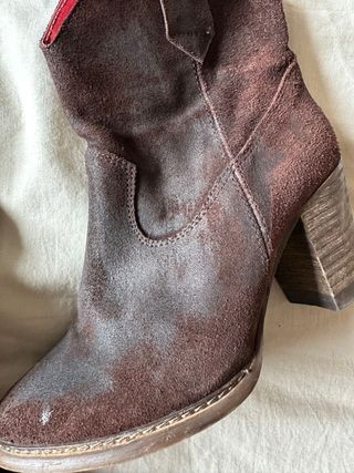 Botín de ante en color marrón. - Tacón grueso. - Punta fina. - Diseño tipo cowboy.