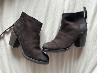 Botines de ante en color marrón. Están un poco gastados como se muestra en la imagen. Tienen un tacón grueso y un diseño moderno. - Material: Ante - Color: Marrón - Tacón: Grueso - Diseño: Botín
