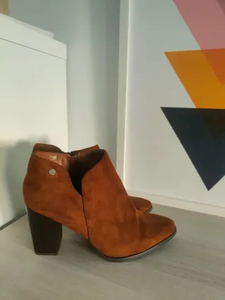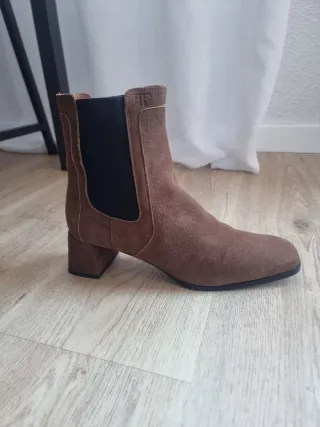 Botines de ante en color marrón. Súper cómodos y de alta calidad, como todo lo de la firma Farrutx. - Diseño tipo Chelsea. - Tacón cuadrado. - Detalle de elástico lateral. Usado para asistir a dos eventos de trabajo, nada más. Pero soy muy alta y no uso apenas tacones, por eso los vendo. Al comprarlos pagué en tienda 239€.