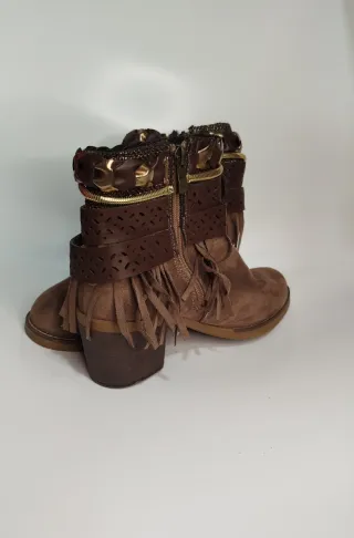 Botín de piel de ante con un diseño de flecos. Estilo boho. muy cómodos por su tacón ancho de 6 cm y en muy buen estado. Los vendo porque me están muy justos. - Material: Piel de ante. - Color: Marrón. - Detalle de flecos.