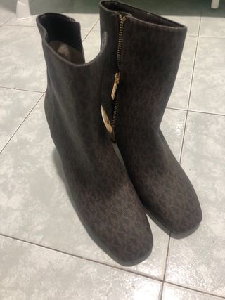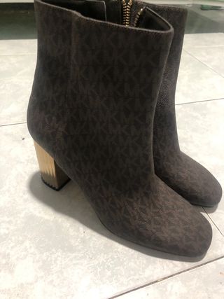 Elegantes botines Michael Kors. - Diseño con monograma MK. - Tacón cuadrado con acabado dorado. - Cierre de cremallera lateral.