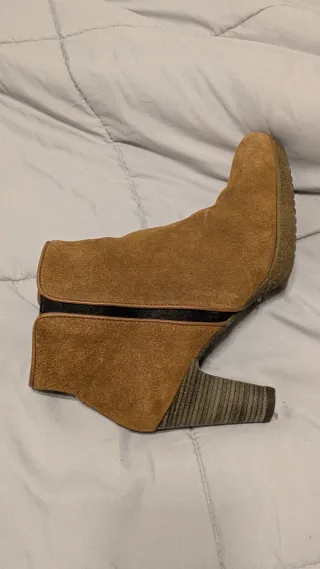 Botines de ante en color marrón. Están nuevos usados dos veces literalmente. Precio en tienda 200€ - Tacón de aguja. - Diseño de caña baja. - Suela de goma.