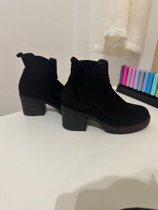 Botines de tacón de la marca Marypaz. Los compré hace unos años y me los he puesto muy poco, los vendo ya que no los uso. - Material exterior de microfibra. - Diseño elástico en los laterales para facilitar su puesta. - Tacón grueso para mayor comodidad y estabilidad.