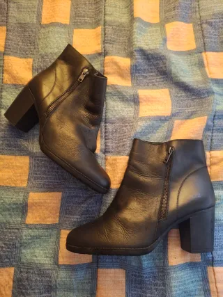 Botines de la marca Marypaz en color negro, diseño clásico y muy combinable. Tacón ancho y estable, cómodos tanto para el día a día como para vestir más arreglada. Cierre lateral con cremallera en perfecto funcionamiento. Plantilla interior de piel como se puede ver en la foto (símbolo de piel en el interior). Exterior acabado efecto piel. Talla: 39 Altura aproximada del tacón: 7–8 cm Estado: muy buen estado, solo se ha usadodo un par de veces. Suela en muy buen estado como se puede ver en la foto. Ideales para otoño e invierno, combinan fácilmente con vaqueros, vestidos o looks más formales. Precio: 18 € (negociable).