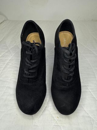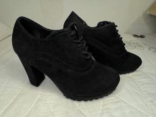 Preciosos botines negros de tacón, ideales para cualquier ocasión. Son de ante y tienen un diseño clásico con cordones. - Tacón cómodo y elegante. - Material: ante. - Estilo: clásico con cordones. - Perfectos para usar a diario. - Talla 37