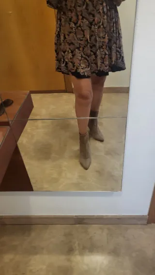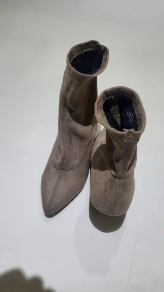 Botines de tacón en ante, marca Marypaz, talla 39. Tienen desperfectos por dentro (en la piel sintética) como se puede ver en la foto, pero por fuera están perfectos. Además incluyen unas tapas para el tacón de repuesto. Quedan muy elegantes y son cómodos de poner y quitar porque llevan una cremallera lateral. Los vendo porque no puedo usar tacón. Sólo los he usado 2 veces, aunque tienen varios años.