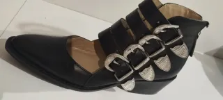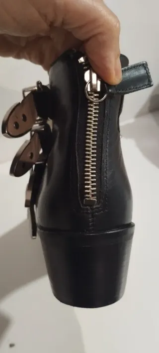 Botines negros con detalle de hebilla y tacón. - Material exterior de piel. - Cierre lateral con cremallera. - Tacón grueso. - Diseño moderno y elegante. - Muy comodos - Usados pero bien conservados