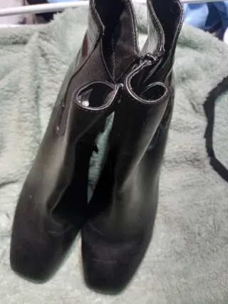 Botines de piel en color negro. Estan nuevos , les puse tapas y suelas para que no resbalasen y son super comodos pero he tenido un problema y no puedo usar tacon - Tacón fino. Medida : 6,5 cm - Punta cuadrada. - Cierre de cremallera lateral.