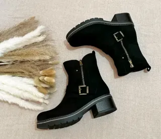 Botines negros de ante con detalle de goma elástica en la caña. Son ideales para un look casual y cómodo. - Tacón grueso y cómodo. - Material: ante. - Diseño elegante y versátil. - Perfectos para el otoño/invierno.