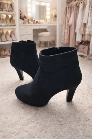 Botas de caña corta de ante con tacón grueso de 9 cm Están en perfecto estado, las vendo porque el tacón es muy alto para mí Un básico para cualquier armario. - Material: Ante - Tacón: Bloque - Cierre: Cremallera trasera #cañabaja