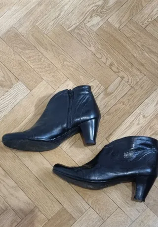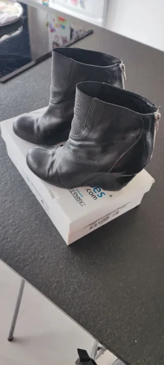 Botines de color negro. Tacón ancho y leve plataforma. De pico y ajustados. Muy cómodos y ponibles. Estan cuidados pero tiene roce en la parte delantera, se disimula bien con betún negro (no echado en la foto para que se vea estado real)
