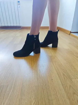 ¡Botines clásicos de ante que nunca pasan de moda! ideales para el día a día por su comodidad y estilo versátil. Estado: Usados, pero en buen estado general. Se nota el uso normal en la suela y ligeras marcas de doblez en el empeine, pero han sido bien cuidados. Talla: 38. Color: Negro mate. Características: Cremallera funcional para ponerlos y quitarlos con facilidad. Tacón ancho de altura media (muy estable y cómodo para caminar mucho tiempo). Suela con buen agarre. Combinan con todo: desde unos jeans rotos hasta un vestido de punto. Un fondo de armario imprescindible para otoño/invierno. #botinesnegros #talla38