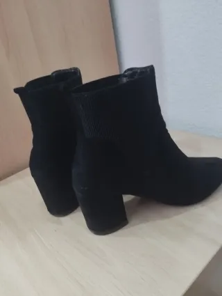 Botines de ante con un diseño elegante. Con elástico en la caña, para facilitar el ponérselos, y sacarlos. Me quedan algo grandes x eso los vendo - Material: Ante - Color: Negro ,tacón comodo - Talla: 38
