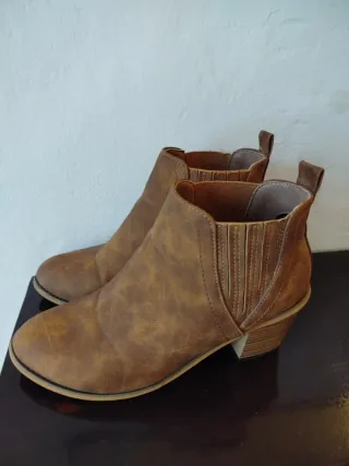 Botines de tacón color camel con cremallera de adorno en el lateral exterior. Tiene dos tipos de material: la parte delantera es como de piel y la trasera de ante. Por dentro tienen pelito, ideal para invierno. Se han usado, pero no hay defectos visibles.