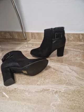 Botines de tacón con acabado de ante. Talla 39. Altura tacón unos 10 cm (comprobar foto con la medida). Solo los he usado en una ocasión. Incluye tapas de repuesto. - Material: Ante - Color: Negro