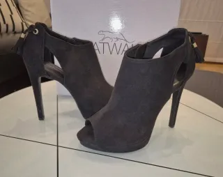 Botines de tacón alto con un diseño moderno y elegante. Perfectos para añadir un toque sofisticado a cualquier atuendo. Usados una vez por error de talla. - Acabado en ante. - Detalle de flecos en la parte trasera. - Apertura en la punta. - Diseño con cortes laterales.