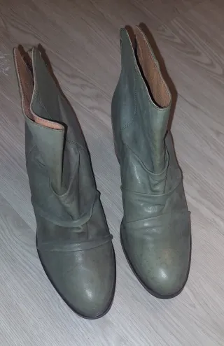 Botines de cuero con un diseño moderno y versátil. - Color verde oliva. - Detalle de fruncido en la parte delantera. - Tacón de altura media. - Cierre de cremallera en la parte trasera.