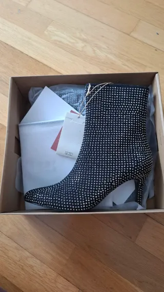 Botín denim de tacón fino -Detalle de tachas alrededor de toda la bota y tacón -Altura del tacón: 7,5 cm -Altura de la caña: 19 cm.Precio original 139€. Nuevos con etiqueta. Son preciosos y super originales.