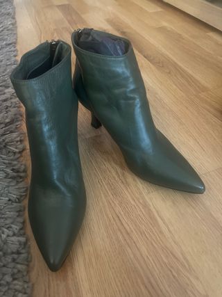 Botines de piel en color verde. - Tacón fino. - Punta afilada. - Cierre de cremallera.