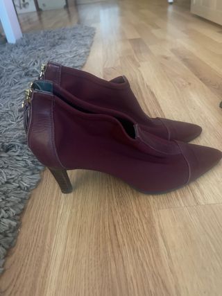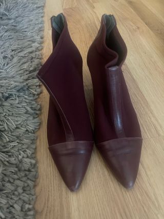 Botines de tacón en color granate. - Punta fina. - Tacón de aguja. - Material exterior textil y piel.