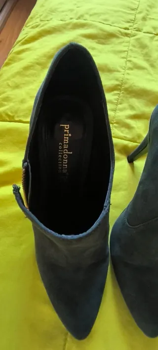 Botines de ante con tacón. - Material: Ante - Color: Marrón - Diseño: Punta fina - Tacón: Bloque Se han llevado 3 dias.