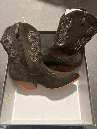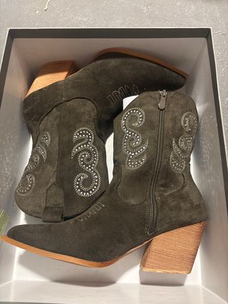 Botines de ante con un diseño vaquero y detalles plateados. - Tacón de bloque de madera. - Cierre de cremallera lateral. - Adornos de pedrería en los laterales.