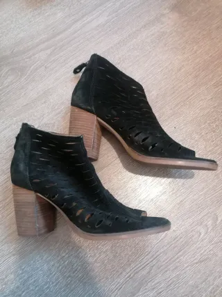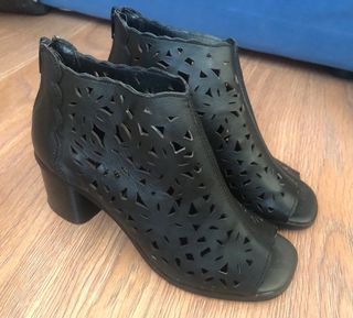 Botines de piel de calidad, perfectos para primavera y verano. - Material: Piel auténtica. - Diseño abierto en la punta y en el talón - Tacón grueso para mayor comodidad. Precio en tienda 90 euros Muy estilosos!