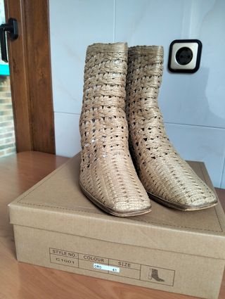 Preciosos botines nuevos, ideales para el verano. Son de color beige y talla 41 - Diseño tejido a mano. - Tacón de madera. - Cierre de cremallera.
