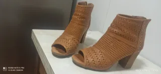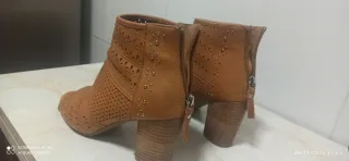Botin de mujer campero primavera verano material perforado y cierre con hebilla. -Tacon de 7,5 cm alto -Exterior antelina. -Color camel . -Talla 38. -Practicamente nuevos solo los e usado 1 dia.