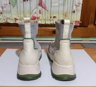 Botines deportivos de piel en color blanco, beige, morado y verde. Diseño moderno y ligero. Fresquitos. Ideales para dar grandes caminatas en primavera-verano. Muy poco uso. En perfecto estado, salvo unas rozaduras en la plataforma. Ver última foto. - Combinación de colores atractivas. - Cierre de cremallera frontal. - Detalle de malla transpirable. - Suela de goma con plataforma.