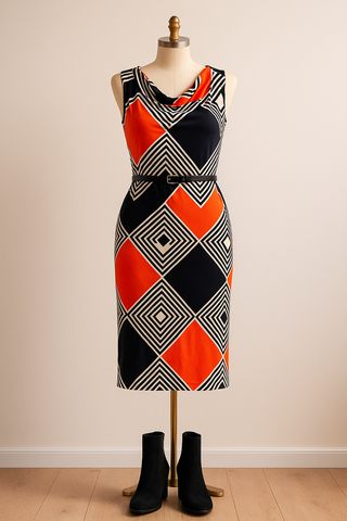 Vestido Anna Field con estampado geométrico en tonos negro, blanco y rojo. Talla 40, confeccionado en tejido ligero y elástico que aporta comodidad y frescura. Diseño sin mangas, con agujeras para poner cinturon fino (lo he perdido entonces tienes la opción de complementar o llevarlo sin cinturón). Muy bien estado, sin signales de uso. Corte recto favorecedor, fácil de combinar con sandalias, botinas o zapatillas. ¡Un look moderno y llamativo para tu armario!