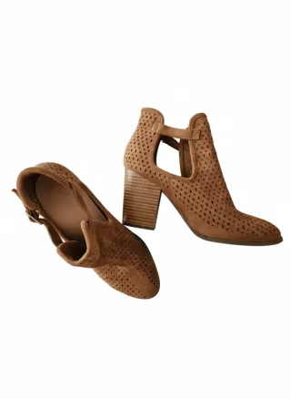 Preciosos botines de ante marrón, ideales para el verano. Son de tacón alto y tienen un diseño con perforaciones. Se venden en pareja. - Material: Ante. - Tacón alto. - Diseño con perforaciones. - Color marrón.