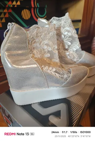Botines de fiesta o para el verano, con un diseño brillante y detalles de encaje. - Talla 39/40. - Acabado en plateado. - Tacón de cuña plana