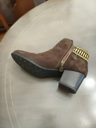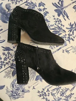Botines de ante con detalles decorativos. - Cierre de cremallera lateral. - Adorno metálico en la caña. - Tachuelas decorativas en la parte delantera.