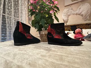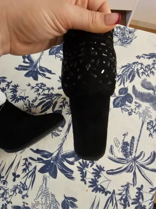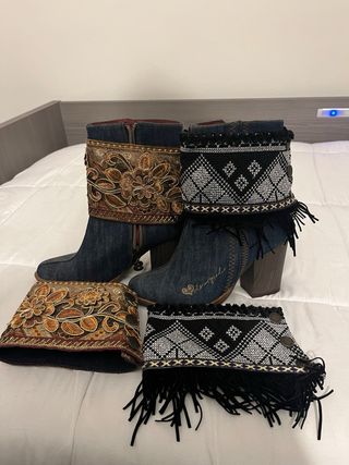 Botines de estilo vaquero con un diseño llamativo y original. Puestos unas horas. No estoy acostumbrada a andar con tacón. En su caja original - Detalle bordado con lentejuelas. - Cremallera lateral para facilitar su uso. - Tacón cuadrado.