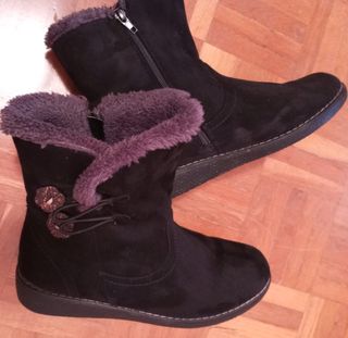 Botines negros para mujer con un diseño moderno y cómodo. - Detalle de pelo en el interior y borde. Muy calentitas. - Cierre de cremallera lateral. - Adorno de botones y cordón elástico en el lateral. - Suela de goma Tiene un boton desigual en la bota izq. pero no desencaja.