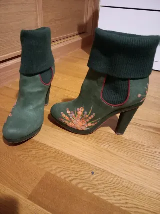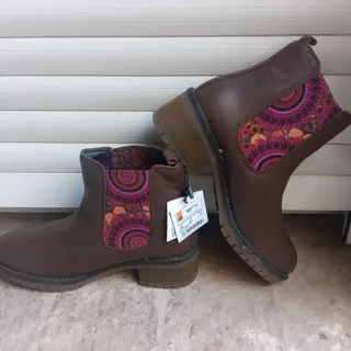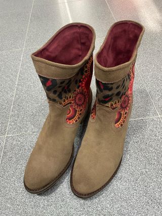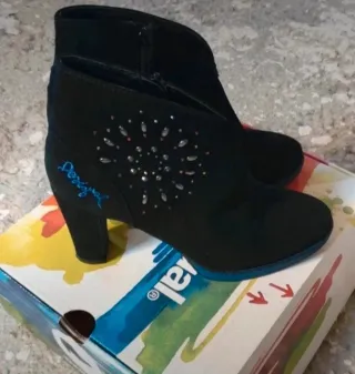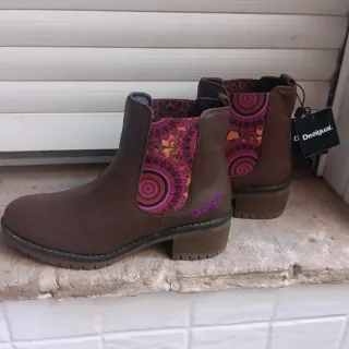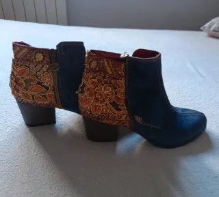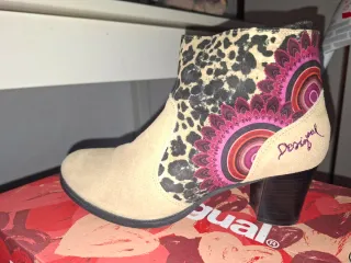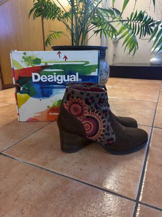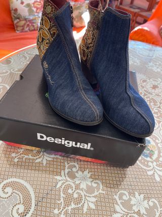 Botines de la marca Desigual con un diseño único.Muy orginales Rebajados - Detalle de bordado multicolor en la caña. - Cierre de cremallera lateral. - Tacón de bloque. Precio nuevo 90 euros medida del tacon 5"5 cm.Precio algo negociable