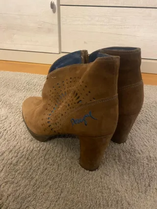Botines Desigual con un diseño único y detalles perforados. - Material exterior de ante. - Tacón alto y plataforma. - Cierre de cremallera lateral. - Detalle de bordado en el lateral. Talla 39 con tacón de 9cm están completamente nuevas, puestas solo una vez. Su precio 70 €