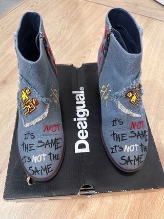 Botines de la marca Desigual, sin usar y en perfecto estado. Presentan un diseño moderno y llamativo. - Tejido exterior tipo denim. - Detalle de estampado étnico en los laterales. - Tiradores traseros para facilitar su puesta. - Suela de goma.