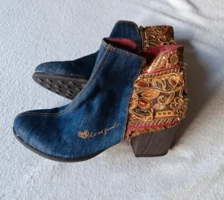 Botines de la marca Desigual en talla 37. Presentan un diseño vaquero con detalles bordados y lentejuelas. - Material exterior: tela vaquera. - Detalle bordado multicolor. - Cierre de cremallera lateral. - Tacón de bloque.