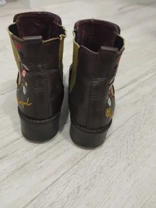 Botines de la marca Desigual en talla 36. Un diseño original con detalles bordados. - Color marrón. - Adorno de flores bordadas en el lateral. - Detalle elástico lateral para facilitar el calce.
