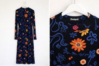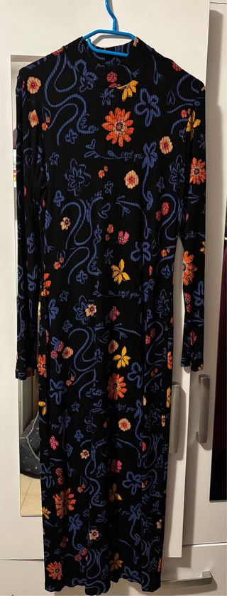 Vestido largo original de la marca Desigual, de manga larga y con precioso estampado floral multicolor sobre fondo negro, muy característico de la marca. Tejido elástici, cómodo y con buena caída, ideal para otoño, invierno y entretiempo. Es un vestido que queda ceñido al cuerpo. Es una XL pero una persona de talla 38 a 44 se lo puede poner perfectamente. Favorece mucho puesto y es perfecto tanto para el día a día como para ocasiones especiales, combinado con botas o botines. Usado en una ocasión.