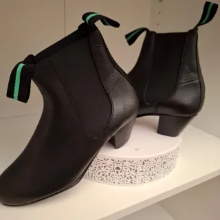 Botines de flamenco en color negro, talla 39. Tienen un detalle de dos bandas verdes en la parte superior. En su caja - Diseño clásico de botín. - Puntera y tacón con clavos y de madera - Detalle de tira elástica lateral. - Tira decorativa en la parte superior. - Diseño clásico de botín. - Material exterior de cuero. - Suela de goma.