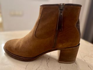 Botines de ante marrón, talla 39, aunque tallan pequeñas. Tacón de 7,5 cm. Son de estilo casual y tienen un tacón bajo. - Material: Ante. - Color marrón. - Cierre de cremallera lateral. - Detalle de hebilla en el tobillo.