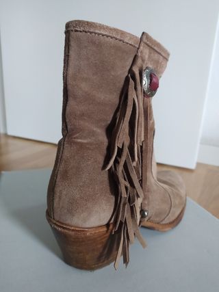 Botines de ante en color beige. - Cierre con cremallera lateral. - Detalle de fleco en la cremallera. - Tacón con detalle de metal. Prácticamente nuevos
