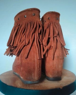 Preciosos botines de piel auténtica con tachuelas y flecos. Estilo étnico perfecto para un look boho, hippie... Cordón de piel, caña ancha que se adapta a diferentes anchos de pantorrilla. Cuña interior de 9 cm. Muy cuidados y en buen estado. Estilo Minnetonka. #botinbohostyle #hakeibota #hakeipiel #botinpielflecos #botinpielboho #bohochic #botahakeipiel #hakeipiel #botinveranomujer #botahippiepiel #lerenla #estilominnetonka