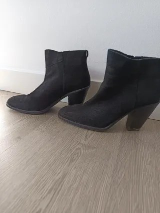 Botines de ante con tacón. Un básico para tu armario. - Tacón grueso y cuadrado. - Punta fina. - Cierre de cremallera lateral. Piel Algun roce en tacon pero puestos dos dias
