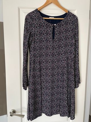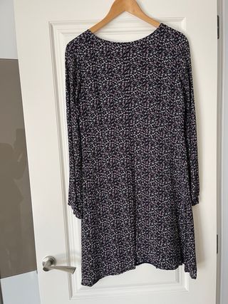 Vestido corto de estilo casual en color azul marino con estampado floral en tonos claros. El tejido es ligero y con un toque elástico Lleva manga larga y un detalle de abertura en el escote con cierre decorativo. Muy cómodo y versátil, perfecto para uso diario, entretiempo o para la oficina. ✔ Tejido suave y fluido ✔ Corte suelto y favorecedor ✔ Escote con pequeña abertura y botón ✔ Ideal para primavera/otoño ✔ Forro azul marino de gasa Perfecto para combinar con medias y botines o zapatillas para un look más relajado.