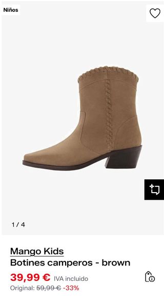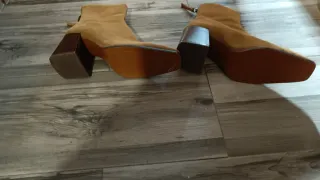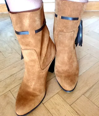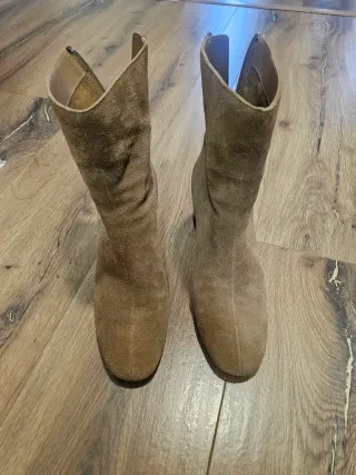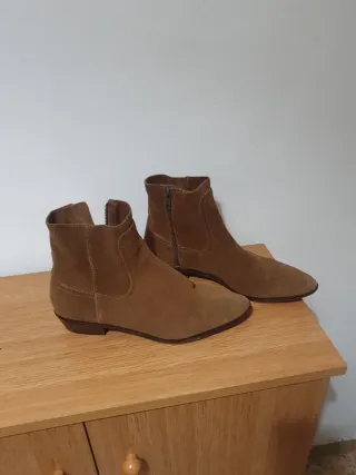 Vendo botines estilo Chelsea de la marca Mango en talla 42. Son de ante color marrón, cómodos y combinan con todo. Presentan un uso normal pero están en buen estado general, sin roturas ni daños importantes. Ideales para looks casuales o más arreglados.